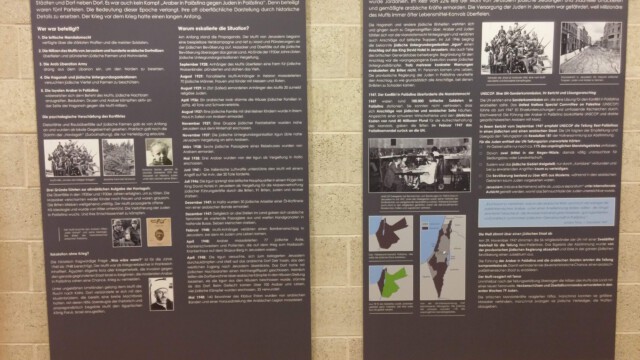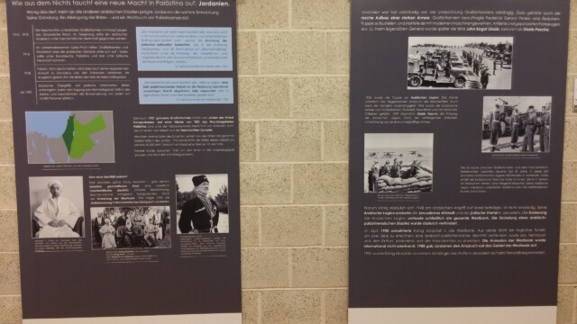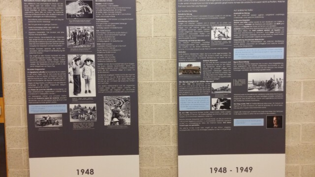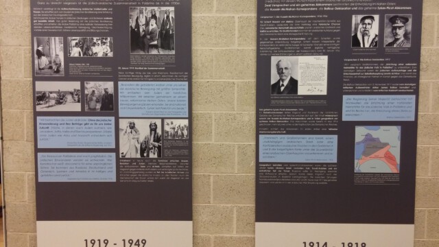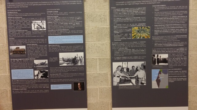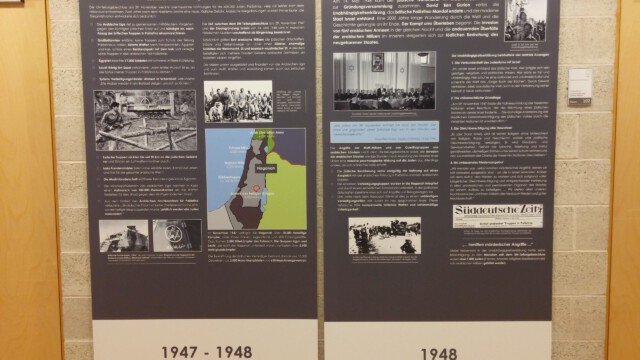 32 Tafeln geben einen vertieften historischen Einblick in die politischen und gesellschaftlichen Ereignisse. Bilder, Dokumente und Zeitzeugen werden im Kontext präsentiert. In einem weiten Bogen von den Römern im Jahre 70 bis zum Waffenstillstand 1949 werden die Staatsgründung Israels und ihre Vorgeschichte erzählt.